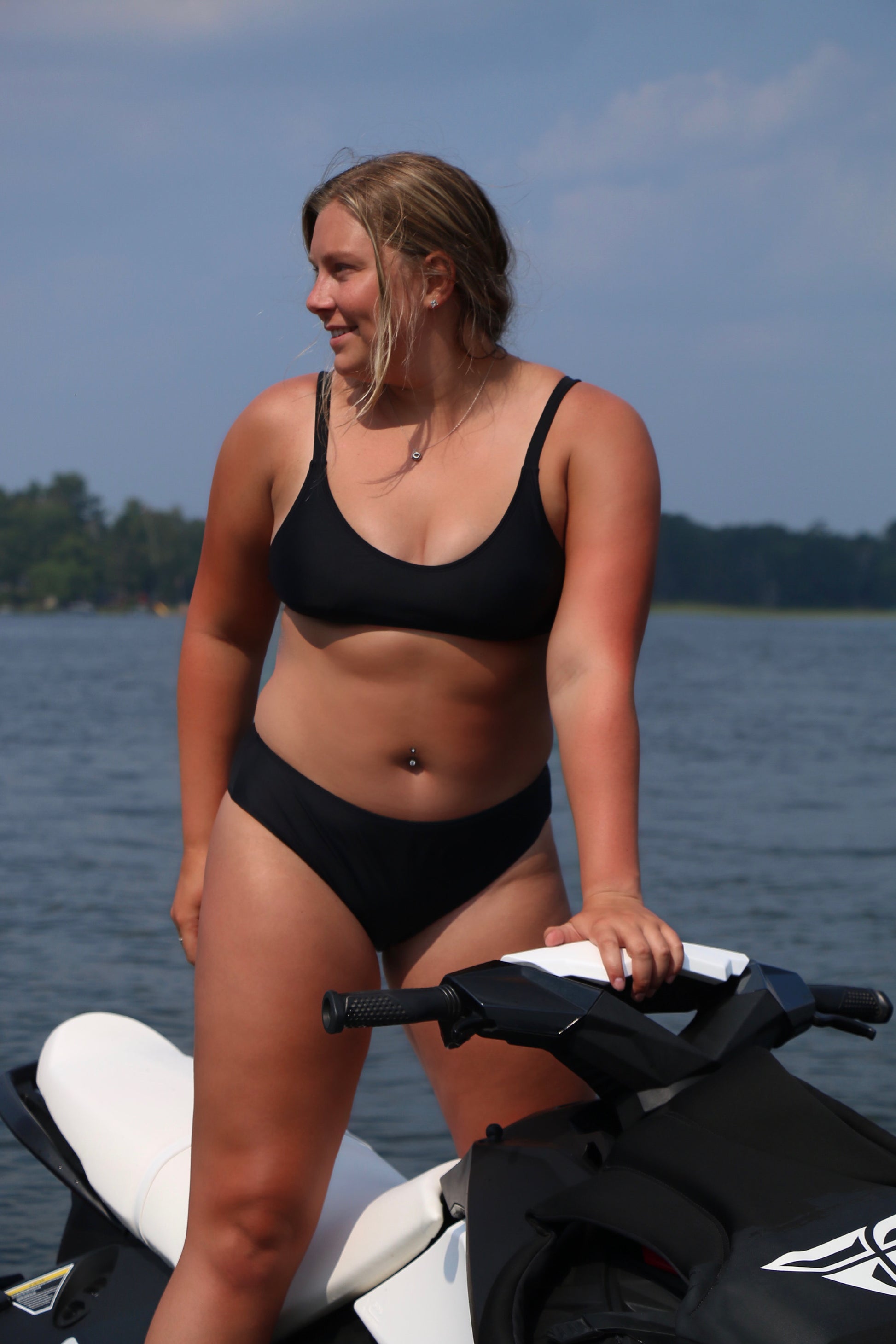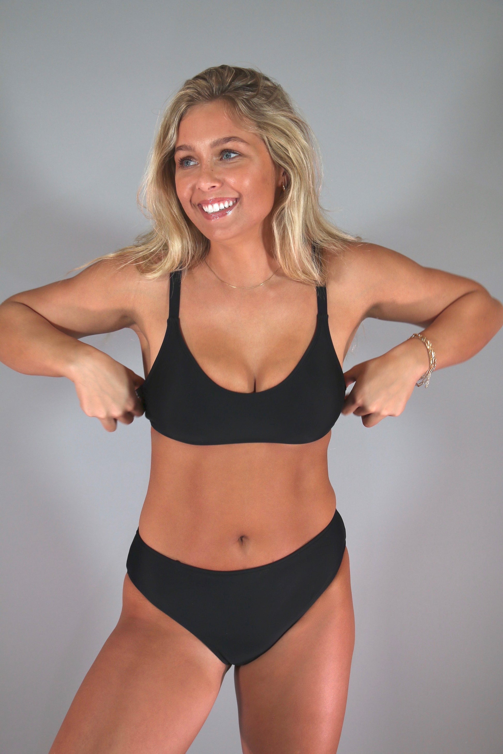 This universal top comes with soft removable padding and adjustable shoulder straps for more support and shaping. The scoop neck allows for better control and sizing for different busts sizes.